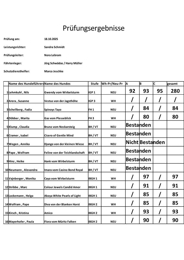 | Hundeführer | Hund | Stufe | Ergebnis |